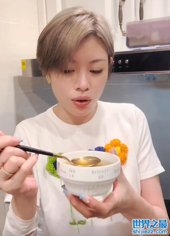 汤做好之后,葛荟婕自己先来了一碗,看她这认真的模样,真像一个十足的吃货。