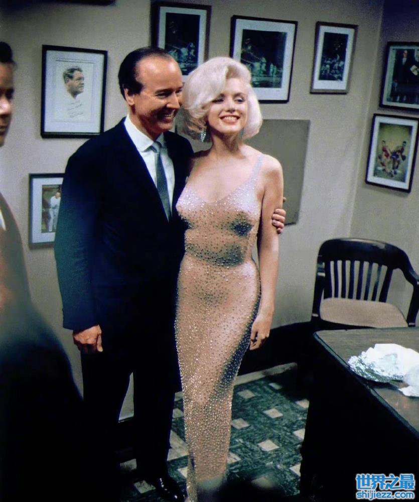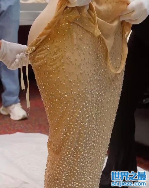 其实这款礼裙来头不小,是玛丽莲梦露的1962年经典裙子。当时这条裙子是梦露曾为肯尼迪唱生日快乐歌所穿的礼服,裙子上饰有手工缝制的6000多颗水晶。