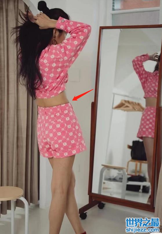 在对镜拍照时,吴速玲抬手撩着自己的长发,短上衣也往上跑了几分。吴速玲纤细的腰肢也展露了出来,但不知道是不是裤子太紧,吴速玲腰部都被勒出了赘肉。