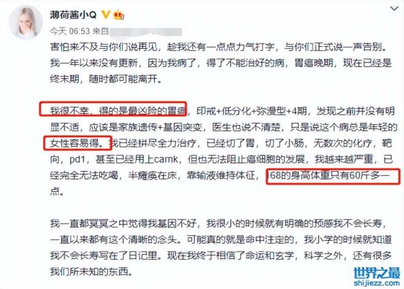 近日,某知名美妆博主薄荷酱小Q在社交平台发布自己患胃癌的消息。在她发的长文中我们可以感受到满满的悲伤与无奈。小Q表示,自己患的是最凶险的胃癌,应该是家族遗传和基因突变导致,现在的自己一直积极治疗,但逃不过病魔的袭来,甚至168的身高只有60多斤的体重。