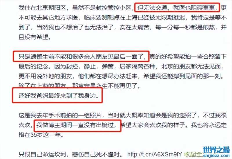 小Q表示,自己所居住的地方因疫情原因无法交通,就医障碍重重。最遗憾的是自己生前不能跟许多朋友家人们见面,虽然身边人尽可能地都赶来她的身边,但因为各种原因阻碍,不过还好小Q的爸妈在自己身边。而小Q表示自己做美妆博主期间一直未曾露面,这次也将放出自己曾经拍的一组艺术照来纪念。