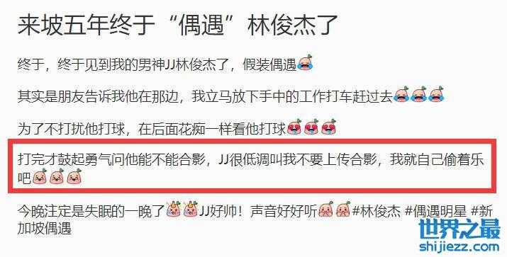 来看看网友描述当天见到林俊杰的心情,林俊杰打完球后,她上去求合照,但是林俊杰特意交代要低调,不要上传合影。