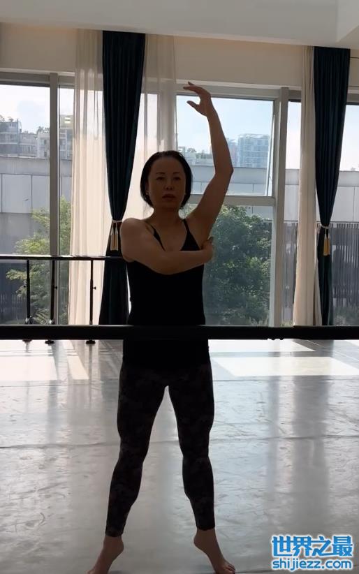 视频中的她时而摆出芭蕾舞的姿势举起一只手过头顶,时而双手同时缓缓抬起过头顶,边锻炼边大口吸气呼气,看得出锻炼中的她尽管略微有些辛苦吃力,但仍然坚持不懈,不断挑战自己。