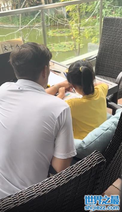 除了日常的训练,笑笑在学习上也没有落下什么。图片中王楠丈夫陪伴着女儿坐在桌前写着作业,耐心地讲解笑笑不会的题目,而窗外景色优美,不过笑笑并没有被影响,而是专注的写着作业。