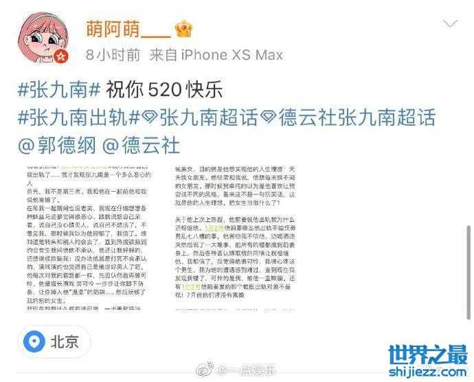 网友@萌阿萌___ 爆料张九南出G,自称是在张九南离婚后才在一起的!没想到张九南却背着她与其他女生约会,而且还上了热搜!才得知自己被绿了,而且还曝张九南人品差,曾喝酒后将所有过错推到前妻身上,然后博取她的同情,同时还曝光了很多记录........。目前张九南方并未回应。