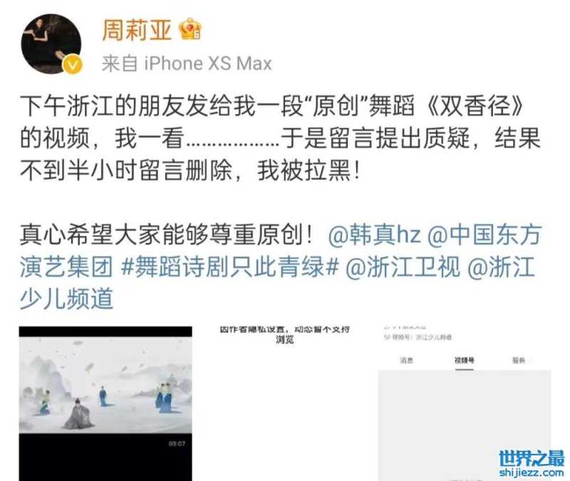 《只此青绿》导演周莉亚,在社交平台上发文,称浙江少儿频道的“原创”舞蹈《双香径》,抄袭《只此青绿》,他去官方账号留言提出质疑,却被拉黑。