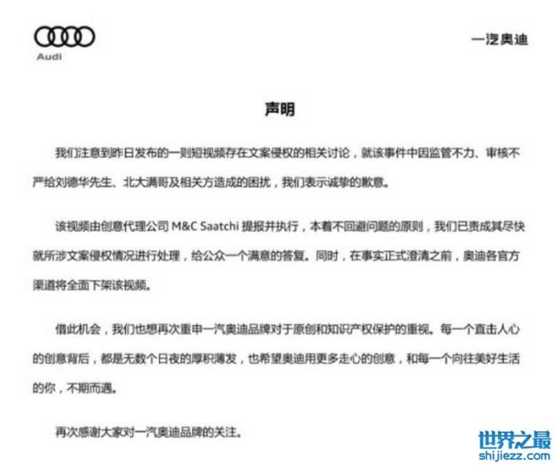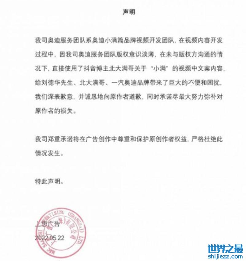 至于奥迪方与广告代理方后续之间的操作与工作人员的失责问题,这无关北大满哥与刘德华这一边。北大满哥在最新声明中表示两个公司的负责人还进行了当面的道歉,他愿意接受这份道歉。