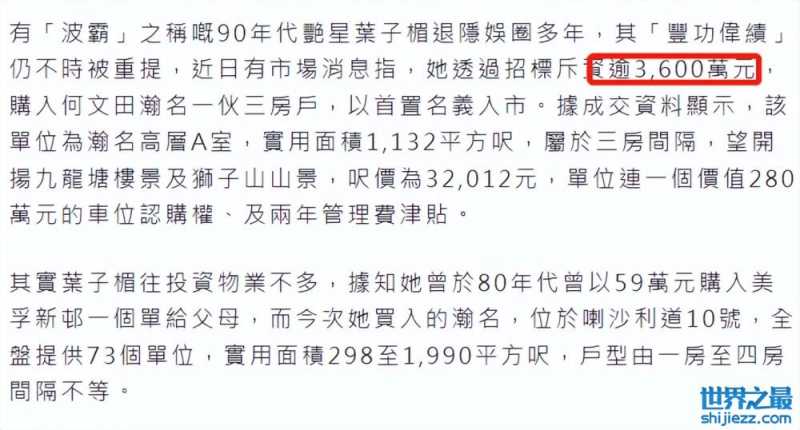 据说此次叶子媚购物的房子相当奢华,价格大概在三千万左右,在80年代购物了一套房子送给父母之后,这好像是叶子媚第一次买房,无论是地段还是房子大小,都很符合香港豪宅的标准。