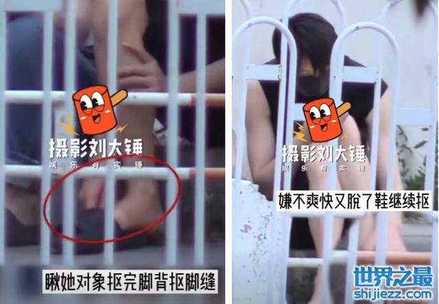 视频中哈尼克孜和这名男子一人手中拿着一杯奶茶,这位男生坐在路边,一开始脚穿拖鞋将手伸进拖鞋里抠脚趾,逐渐他像是嫌这样抠得不爽快又将拖鞋脱掉,直接翘起二郎腿用手随心所欲地大胆摸脚和抠脚趾。