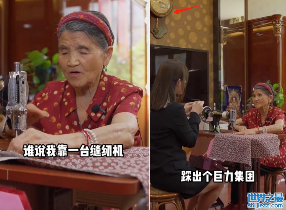 当天刘丽芹在豪宅内一边踩缝纫机一边和孙女聊天,家中装修得十分精致,墙上一面复古的挂钟格外抢镜。在聊天时,刘丽芹说他们家的集团并不是自己靠缝纫机踩出来的,十分谦虚,一点也不想炫耀自己的功劳。