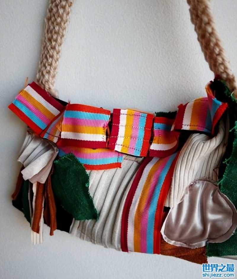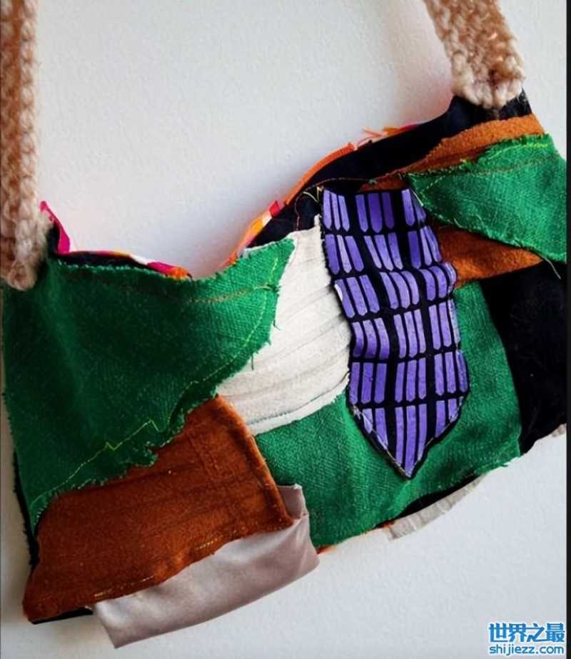 还有一个这种包包,仔细看碎布的拼接,缝纫机制作的线路都在上面,而且最难得的就是黄多多还考虑到了不同的颜色用不同的线,采用不同的布块进行拼接,挺有意思的一次艺术设计。