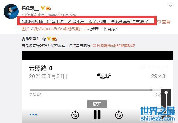 胡耘豪女友转发孙恩静好友的博文,说:“ 我叫杨欣颖,没有小名,不是小三,问心无愧,请不要再制造事端了。 ”