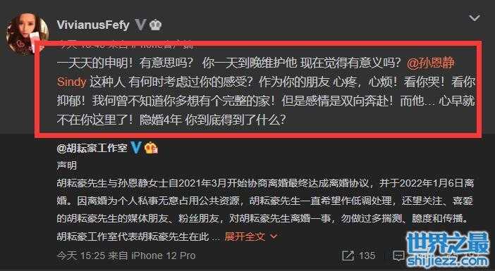 孙恩静的朋友也站出来发声,说她为了维护胡耘豪,这种人一直都没考虑过女方的感受,作为朋友,真的心疼,心烦,看见你哭,你抑郁,我何曾不知道你多想有个完整的家,但是感情是双向奔赴,而他,心早就不在你这里了,隐婚4年,你到底得到了什么?