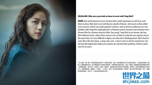 朴赞郁也向记者表达了他对汤唯的印象:“她很难读懂,她就像一个深渊、一座深井……我不想形容她为神秘,但她有一种让你好奇的深度。”