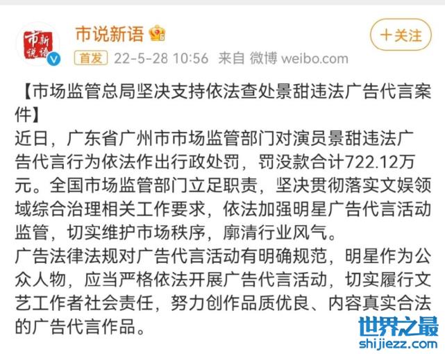 在此情形下判定身为代言人的景甜涉嫌违法代言,毕竟公众人物接代言之前,理应全面了解产品的功效与品质,而景甜显然没有经过有效途径对代言商品的功效进行核实,后期过程中以自身形象为噱头为推广该产品的虚假功效,为此,广州天河区的市场监管部门依旧相关法律规定,对景甜做出没收违法所得的257.9万元,外界罚款464.22万元的行政处罚决定,共计金额总数为722.12万元。