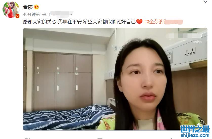 近日,金莎在确诊肺炎之后,首次在社交平台中晒出了隔离治疗的视频报平安。镜头中的金莎目前正在医院进行单独隔离治疗,她表示自己现在的状态很不错,在特殊的时期,她也希望大家都能够好好地照顾自己。