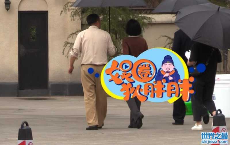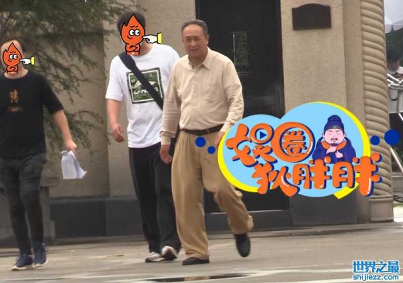 图片中张嘉益和一名女演员、工作人员出现在片场内,路途上不停谈论些问题。他身穿浅色衬衫和西装裤,光亮的脑袋和凸出的肚腩衬得他苍老憔悴。身后的女助理紧跟着一手拿着台词本,另一边手高举遮阳伞很是贴心。