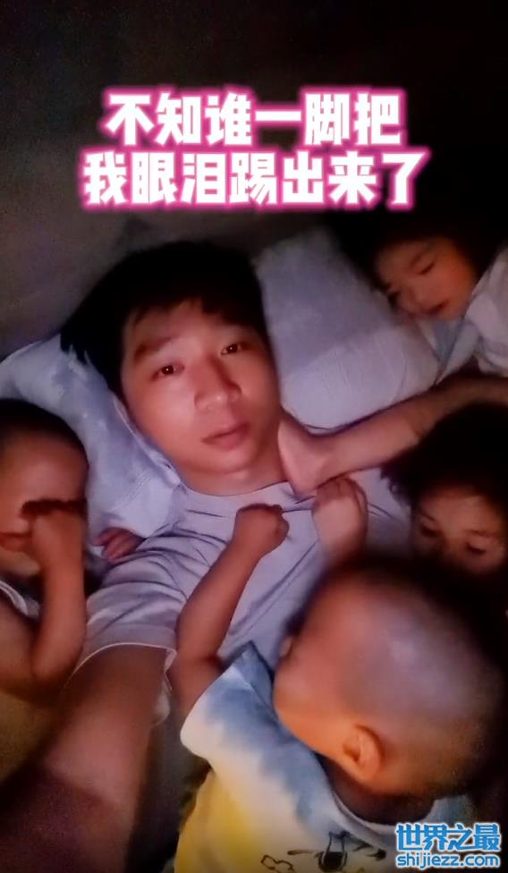 可是没想到的是,最后连两个双胞胎儿子都要求跟爸爸一块睡觉,四个孩子全都环绕在陈大愚身边,真是甜蜜的负担。只见女儿用脚踢到了陈大愚脸上,连眼泪都被踢了出来,陈大愚也是一脸无奈,身边的两个光头儿子也相当抢镜。