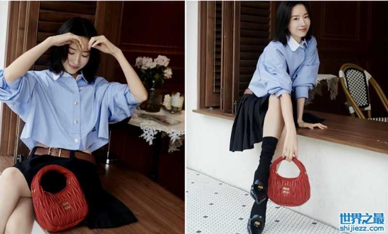 接着,董洁坐在窗台边,她先是用双手抚平头发,微笑看向放在身旁的包包,脸上充满笑意,而她的双手像是一个爱心的姿势,很是可爱俏皮。随后,董洁单手提着包包,一只手撑在旁边。从这里我们看到了董洁下身穿着灰色百褶裙,青春气息扑面而来。