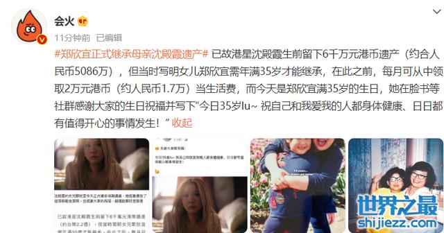 近日,据媒体报道,郑欣宜将正式继承母亲沈殿霞的遗产。据悉沈殿霞在生前留下了6千万元港币的遗产,约合人民币5086万。不过在留遗嘱的时候,沈殿霞专门注明了需要女儿郑欣宜年满35岁才能继承,在此之前只能每月领取2万港币作为生活费。