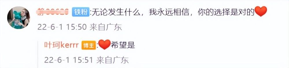 此外,还有粉丝开门见山地询问她与黄晓明的绯闻一事,并表示如果真如外界传言的那样,是不是因为要和黄晓明在一起才选择离婚,如果那样会选择脱粉,对此叶珂也给予网友肯定的回复,安慰对方“放心吧”,由此来说明,黄晓明并非是她结束上段婚姻的理由。