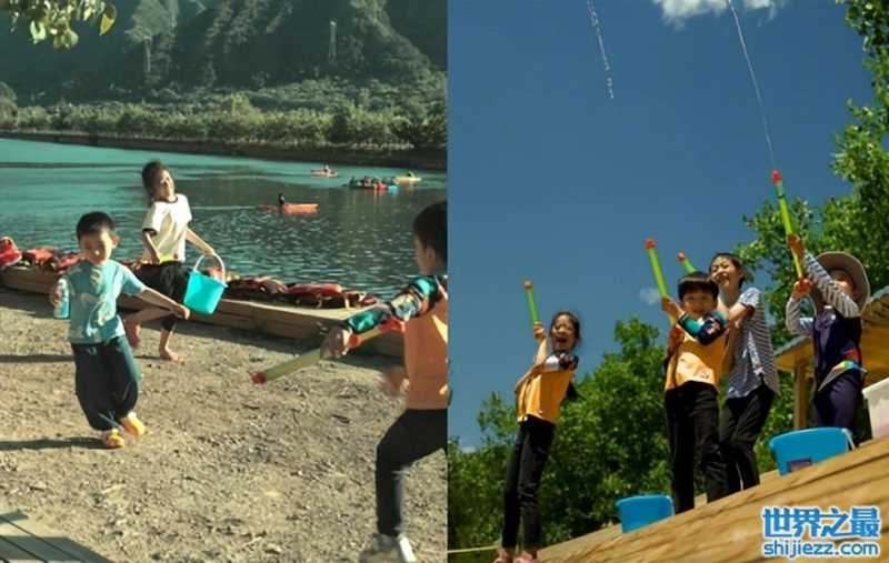这两张图片中孩子们拿着水枪快乐玩耍,每个孩子的脸上都带着笑容,在泥地中互相打闹。大家拿着水枪向天空滋水,充满童年的乐趣,相信每个孩子小时候都会玩水枪吧。