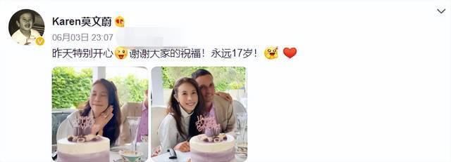 近日,莫文蔚在自己的社交平台上发文庆祝了自己52岁的生日,她发文说,特别开心,也谢谢大家的祝福,自己永远都是17岁。