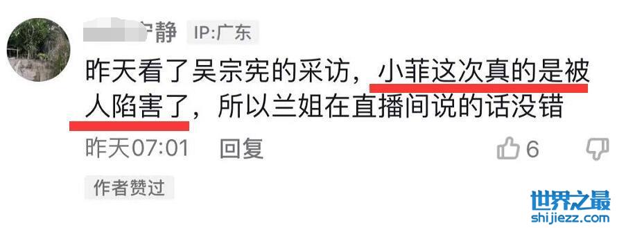 在张兰最新一期视频的评论区可以看到,张兰连连点赞两条评论,分别是:“小菲很善良,但凡坏一点,城府深一点也不会被屎壳郎算计”,“小菲这次真的被人陷害了”。
