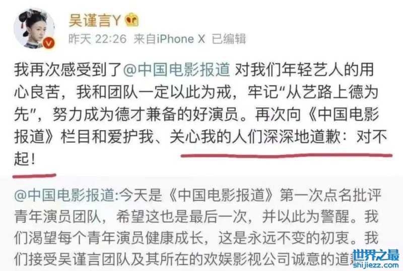 被央视批评后,吴谨言公开道歉,“对不起”。表示会引以为戒,牢记“从艺路上德为先”。