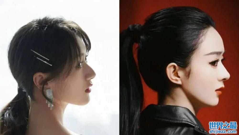 侧面对比就更像了,鼻型,嘴唇都高度契合,区别就是下颌线了,左边袁冰妍下颌线弧度更大,右边赵丽颖下颌角弧度更小。