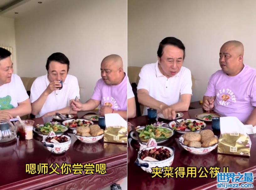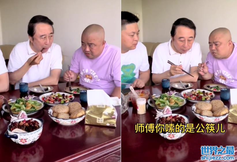 在教完徒弟要用公筷之后,冯巩自己却拿着公筷嗦了起来,并且自己没察觉,还给徒弟夹菜。