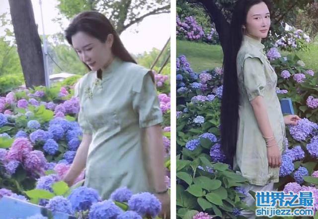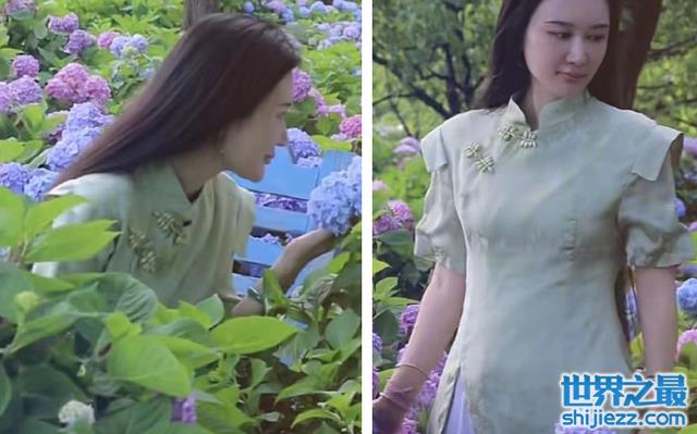 杜星霖身穿浅绿色短袖汉服,和一条宽松的白裤子,露出白皙纤细的手臂。左手戴着成色极好的玉镯,右手戴着金手镯,看起来十分富贵典雅。她穿过开满紫色玫红色花朵的花海,细嗅花香,这画面看起来十分和谐美好。美花配美人,令人赏心悦目。