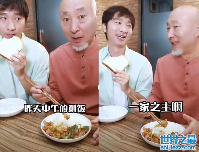 视频中陈佩斯与儿子陈大愚在一起吃早餐,陈大愚在吃面包片,而陈佩斯面前的是一盘米饭、一些肉和小菜。陈佩斯感到疑惑问陈大愚为什么他的早餐是剩饭,然后陈大愚说因为父亲陈佩斯是他们的“一家之主”,这个场面非常有意思,看得出他们家庭关系很融洽。