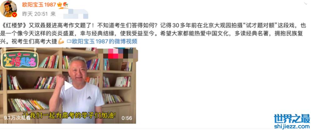 近日87版《红楼梦》贾宝玉的扮演者欧阳奋强在个人社交平台上发视频为高考考生加油,并回应自己演过的经典片段进入今年高考作文题:“30多年前在北京大观园拍摄‘试才题对额’这段戏,也是一个像今天这样的炎炎盛夏,幸与经典结缘,使我受益至今。希望大家都能热爱中国文化,多读经典名著,拥抱民族复兴。祝考生们高考大捷。”