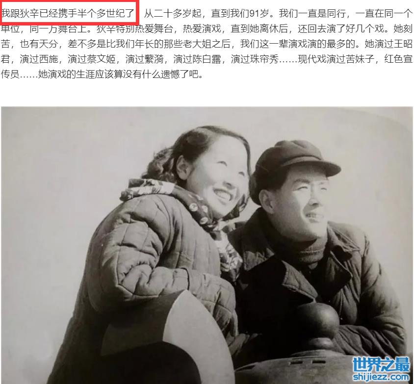三年前,蓝天野的妻子狄辛去世,他曾发长文回忆二人相爱半个世纪的甜蜜恩爱过往。蓝天野老师提到,他们两个人携手半个多世纪的时间,从二十多岁,直到91岁,一直是同行,在同一个单位,在同一个舞台上。