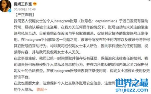 前两天,演员倪妮登上了热搜,不过这次可不是有什么新作品播出,而是她的个人社交账号被盗用。在工作室发出的声明中称,发现倪妮的ins账号出现了互动异常,经确认之后原来是非法盗用了,现在也在积极的和平台联系使账号恢复正常,在此之前,该账号的时候行为都不是她本人所为。