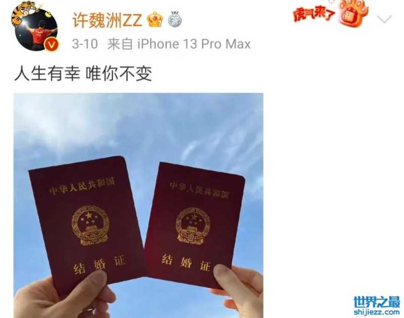 许魏洲跳过恋情,直接官宣结婚,晒出两张结婚证,让人很意外。他的文案简单又浪漫,“人生有幸,唯你不变”。