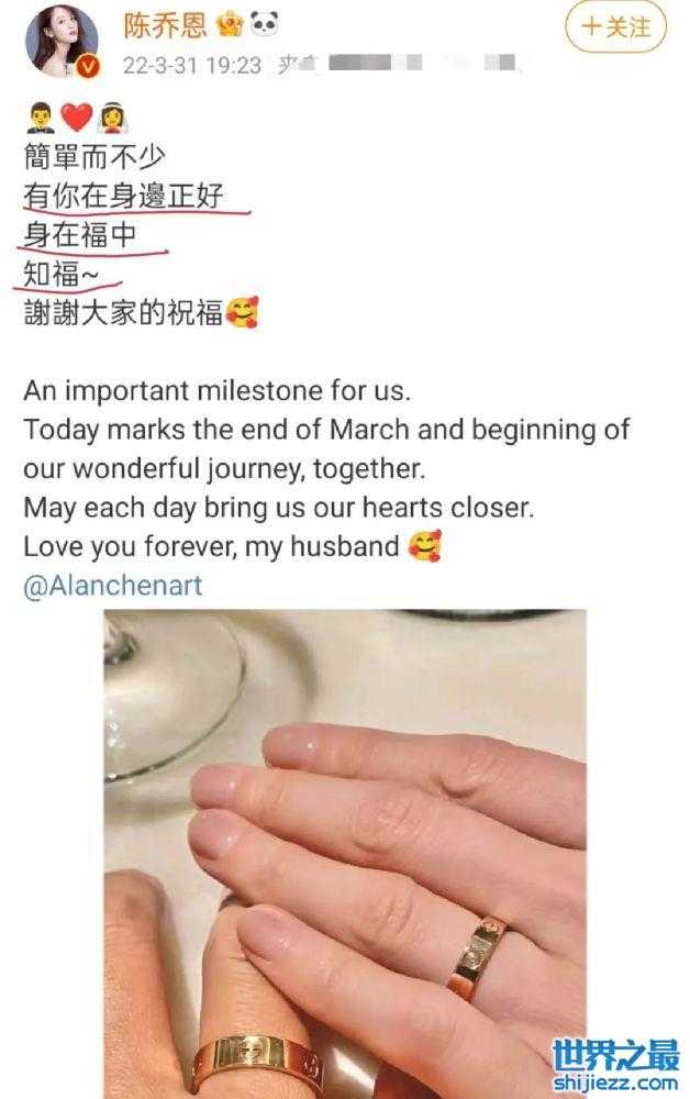 女神陈乔恩,在3月最后一天,和曾伟昌登记结婚,她发文称,“有你在身边正好,身在福中,知福”。并晒二人的婚戒图,大手牵小手,非常甜蜜。