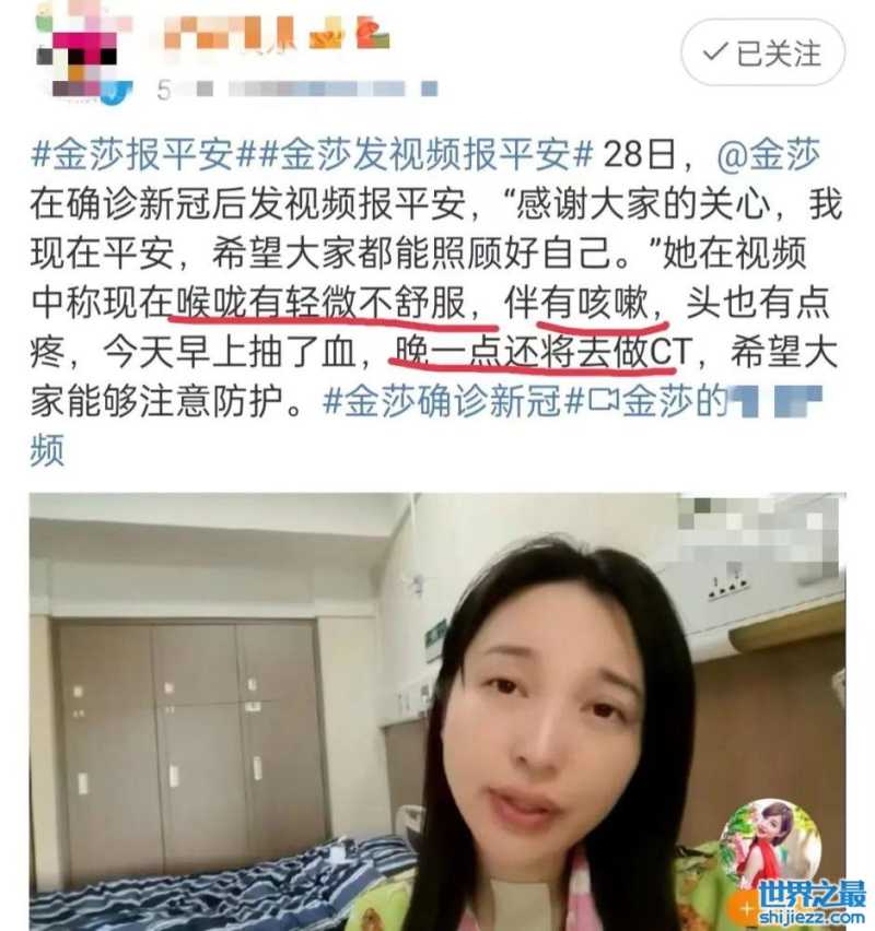 早前,金莎被确诊新冠,据说是因为她在杭州有工作,按疫情防疫规定在酒店隔离,结果在检查时通知是阳性。事发突然,金莎在确诊新冠后第一时间报平安,她简述了自己的症状,喉咙有轻微不舒服,伴有咳嗽。
