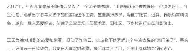 据悉,许倩云将毕生心血都投放在川剧事业上,2012年,已经84岁高龄的她还曾登台表演曲目《评雪辨踪》,年事已高的她当时依旧声音甜美,技艺水准不减当年,获得全场观众的啧啧赞叹。