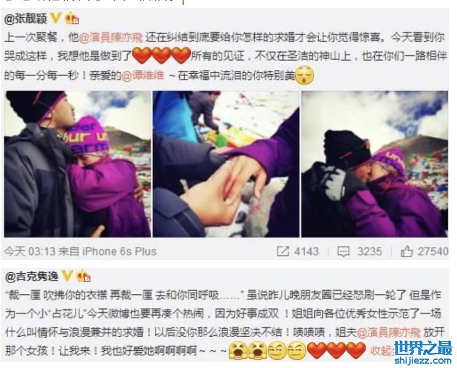 雪山求婚是挺用心,俩人晒的山顶拥吻照片下面也有不少圈内人来送祝福。