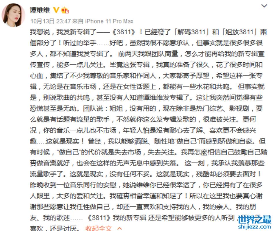 发《3811》那张专辑时她发了一大段动态给自己吆喝,也被大家说成炒作。