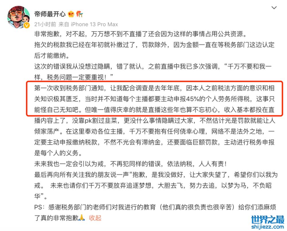事发后,帝师立马在微博进行公开道歉,并辩解称由于自己税法意识淡薄,及相关知识匮乏,如今才导致如此严重的后果。