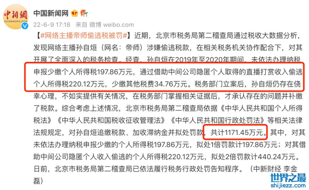 从2016年直播到现在,帝师的身家早已过亿。但是就在6月9号,北京税务局公布,帝师涉嫌偷税漏税,从2019年—2020年,他少缴个人所得税197.86万,通过公司逃税220万,另外还有34.76万的税没有依法缴纳。