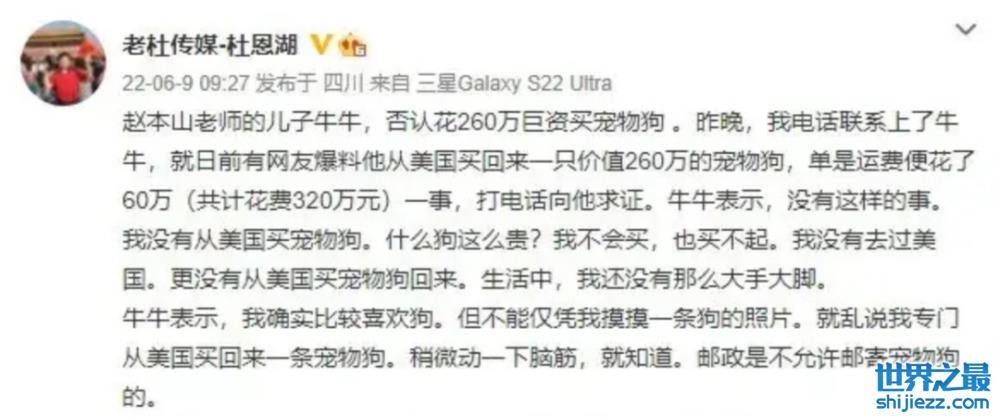 之后,跟本山传媒关系较好的记者,找赵本山儿子牛牛求证。牛牛表示:自己从没去过美国,更不可能花这么多年,从美国买一条狗。