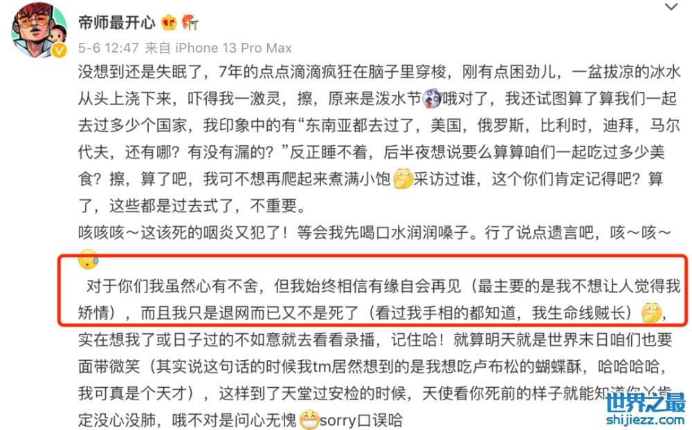 不过在事情被官方曝光之前,帝师就已经被禁止直播,5月份他自述,自己退网了,但以后有缘会相见了。可见,他早就知道出问题了,只是一直在等官方判决。