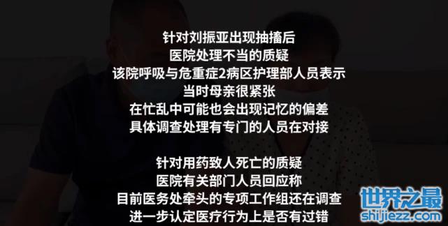就刘振亚出现抽搐后医院处理不当的质疑,医院负责人表示,当时刘振亚的母亲很紧张,可能忙乱中出现了记忆的偏差,另外针对用药致人死亡的质疑,目前医务处牵头已组专项工作组调查,进一步认定医疗行为上是否有过错,不过,媒体多次致电安徽医科大学第一附属医院医患办、党委宣传部办公室电话,均未接通。
