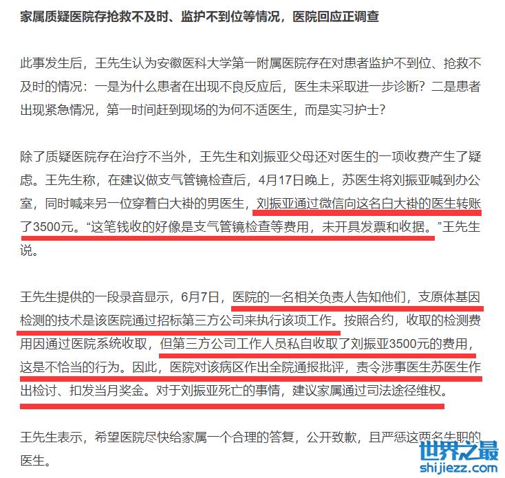 目前,关于刘振亚猝死医院究竟有没有责任,医院方还没有给出回应,该医疗事件还在调查中,不过就刘振亚父母所提到女儿在就医的过程中,将3500元的治疗费用转账给医生的私人账户质疑医生吃回扣一事,医院方已给出了明确回应。