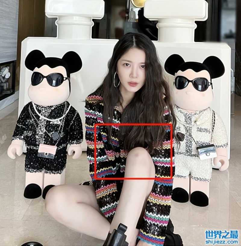之后,王灿换了一个造型,从这张照片中我们看到王灿膝盖处的伤痕十分明显,大概有一枚硬币大小的淤青,但白嫩纤细的双腿依旧性感。而两个玩偶站在王灿身旁,像极了两个护卫。