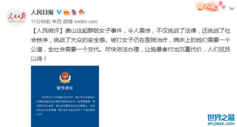 人民日报评唐山打人事件:要让施暴者付出沉重的代价,全社会需要一个交代,给病床上被打的女生一个公道。